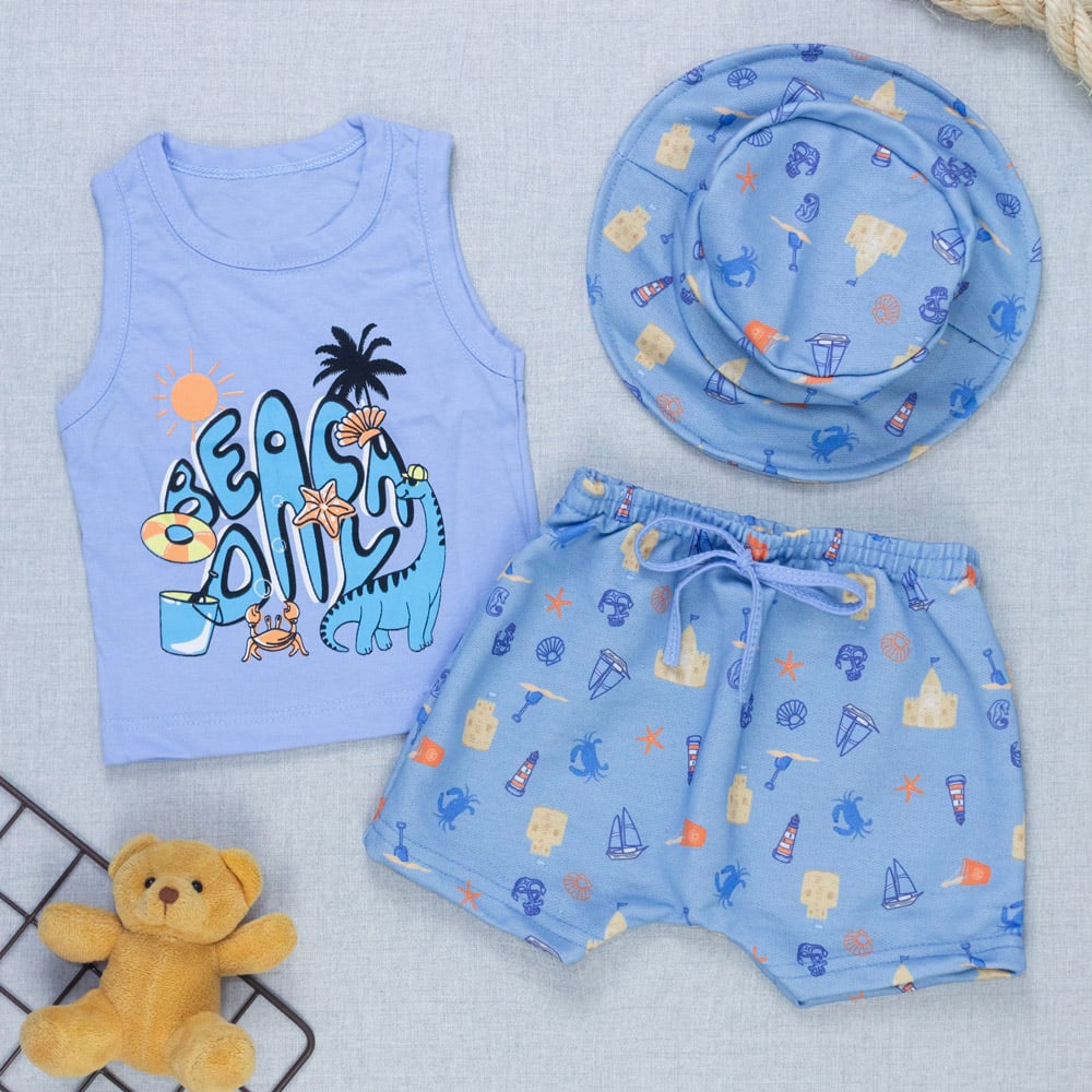 Kit Verão Bebê Regata Estampada, Bermuda E Chapéu Bucket